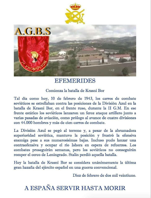 En el apartado de efemérides de la Academia General de Suboficiales del Ejército de Tierra podemos leer una asquerosa loa a esa División Azul que acompañó a las tropas nazis sembrando el terror en el frente oriental durante la II Guerra Mundial.